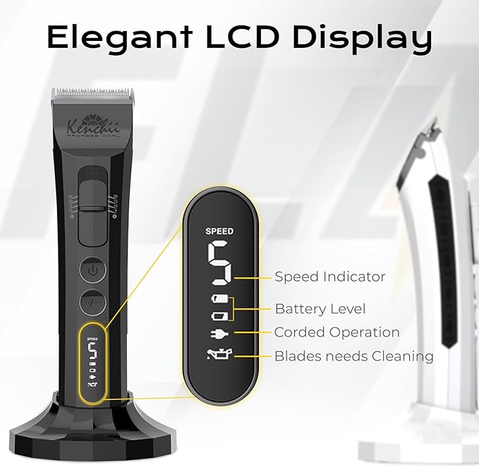 • EASY TO USE: This superior lightweight dog trimmer for grooming utilizes a smart LCD screen to display speed and battery life with a unique blade cleaning reminder. The cordless hair clippers are constructed with stay-cool technology to prevent blades from overheating during use.