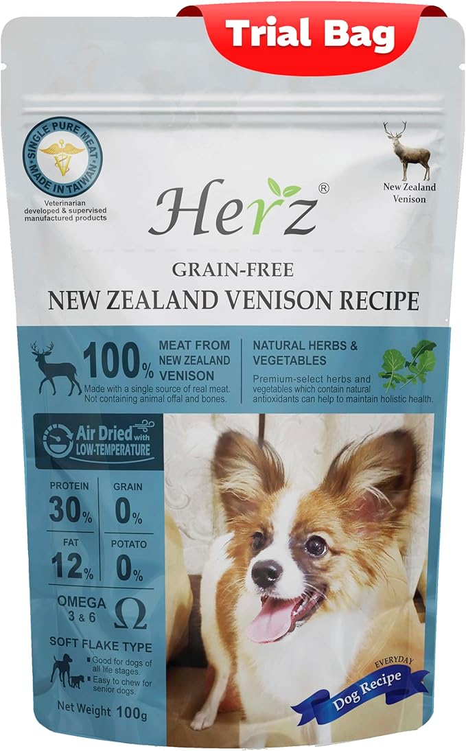 Herz Air-Dried Dog Food – New Zealand Venison Recipe, Single Pure-Meat, Grain Free, All Natural, High Protein, Limited Ingredients 3.5 oz Trial Bag
