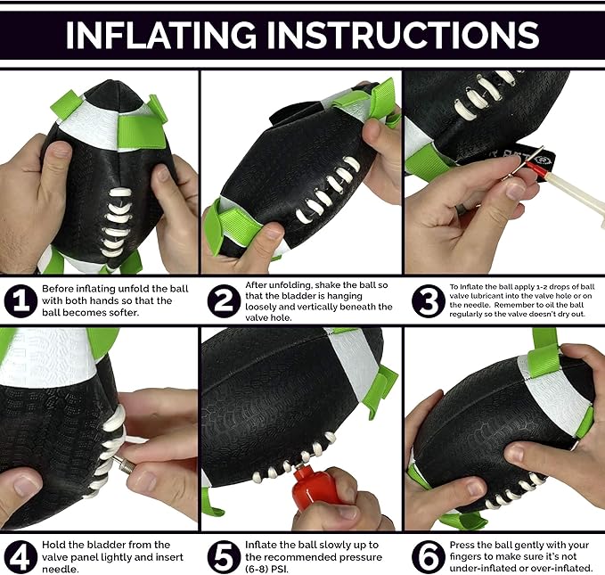 • UNIQUE DURABLE NYLON TABS: Durable nylon tabs are sewn into the seams of our dog football to give your pet a new way to pull, toss and tug the lightweight dog toy. Our dog ball has a handle so you can play too. Ball comes deflated with a standard ball needle included. PUMP IS NOT INCLUDED.