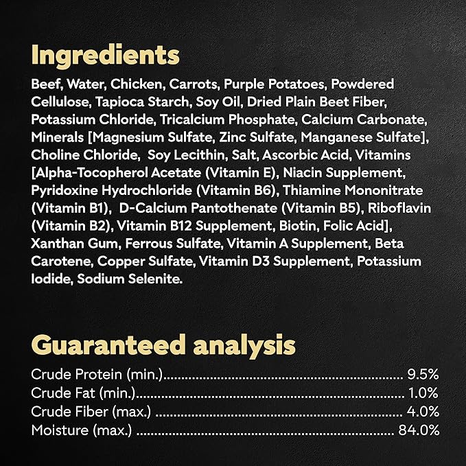 • 10-Pack: Contains ten (10) 3 oz. packs of CESAR WHOLESOME BOWLS Beef, Chicken, Purple Potatoes & Carrots Recipe Adult Wet Dog Food
