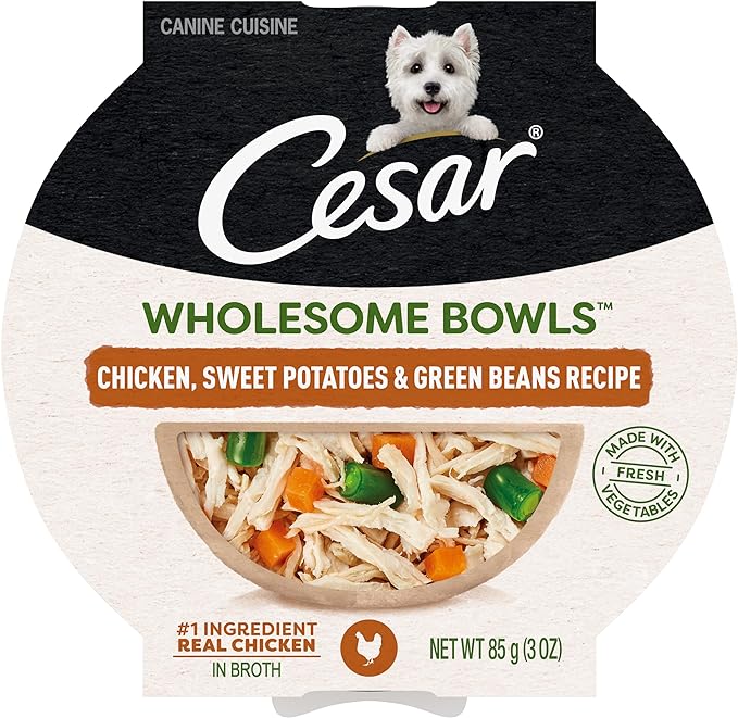 • 10-Pack: Contains ten (10) 3 oz. packs of CESAR WHOLESOME BOWLS Chicken, Sweet Potato & Green Beans Recipe Adult Wet Dog Food