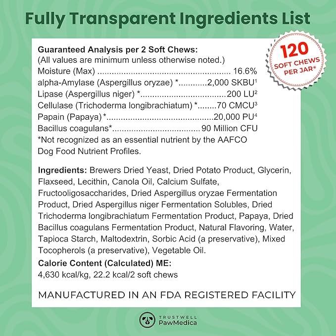 • Support Healthy Dog Digestion - A Pet Probiotic for dogs helps support dog digestive enzymes and assists healthy dog vitamin absorption. Enzyme chews for dogs & digestive enzymes for pets help your dog's GI tract work smoothly and gives your dog gas relief.