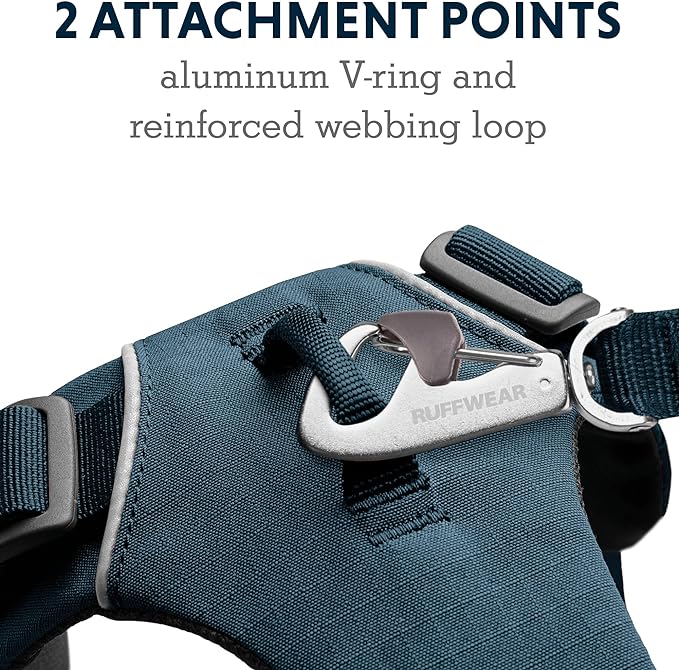 • 2 leash attachment points: Reinforced webbing at chest stands up to pulling and gives additional control (ideal for training, too); Aluminum V-ring centered on back