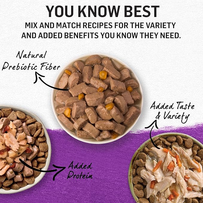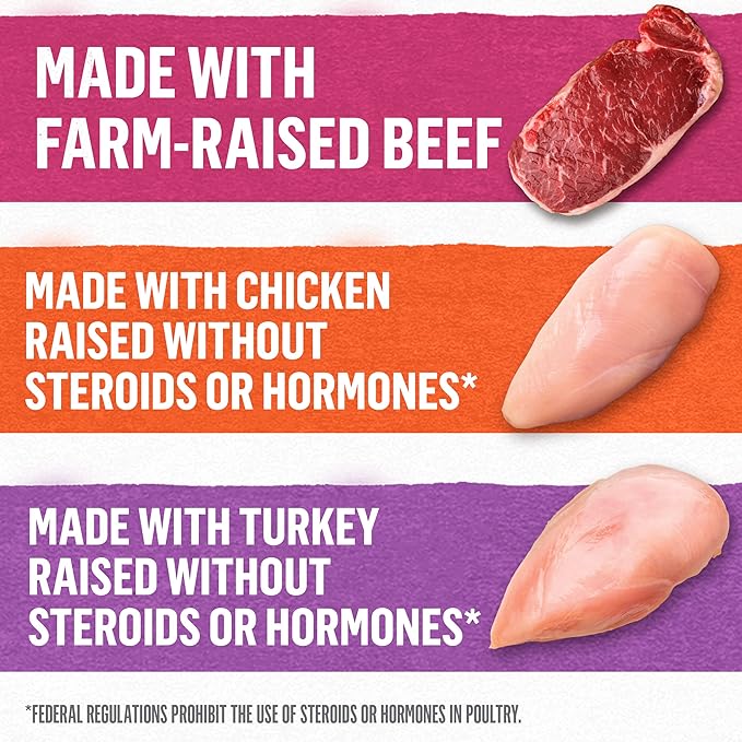 • Canned wet dog food variety pack with natural prebiotic fiber made with real Texas beef, chicken or turkey plus wholesome vegetable accents and a savory gravy