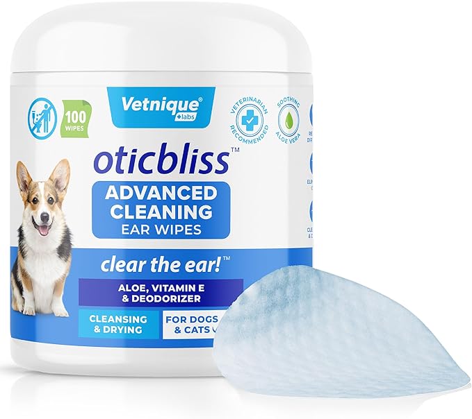 VETNIQUE Oticbliss Advanced Cleaning Ear Wipes for Dogs & Cats for Odor Control, Dirt and Wax Removal with Soothing Aloe Vera, Drying Agent and Vitamin E, Clear the Ear 100ct Wipes