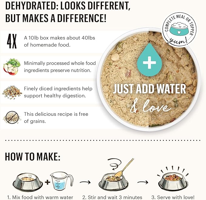 • EASY HOMEMADE: Just add warm water for a wholesome & delicious meal. Serve alone as a complete meal for maximum nutrition, or use as a topper to their dry food.