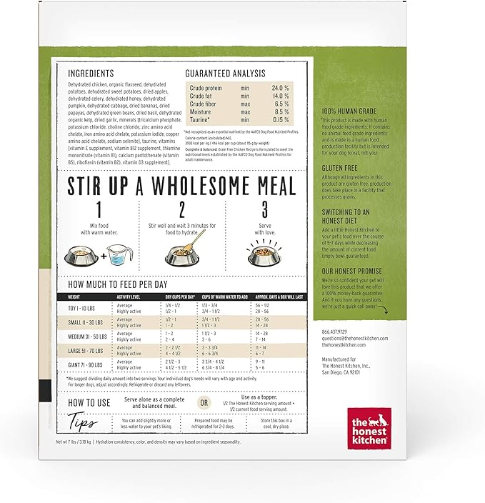 • GRAIN FREE, FREE RANGE CHICKEN: The Honest Kitchen Grain Free Chicken dog food is made with real whole food ingredients like free range chicken, green beans & apples, which are gently dehydrated for maximum nutrient retention and easy digestion.