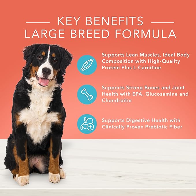 • LARGE BREED DOG FOOD: This delicious, adult dry dog food features high-quality protein and L-Carnitine to support lean muscles and ideal body composition, while EPA, glucosamine and chondroitin support strong bones and joint health