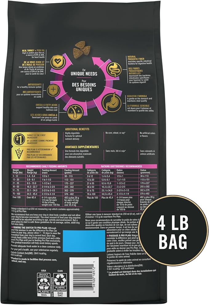 Purina Pro Plan Sensitive Skin and Stomach Dog Food with Probiotics for Dogs, Turkey & Oat Meal Formula - 4 lb. Bag