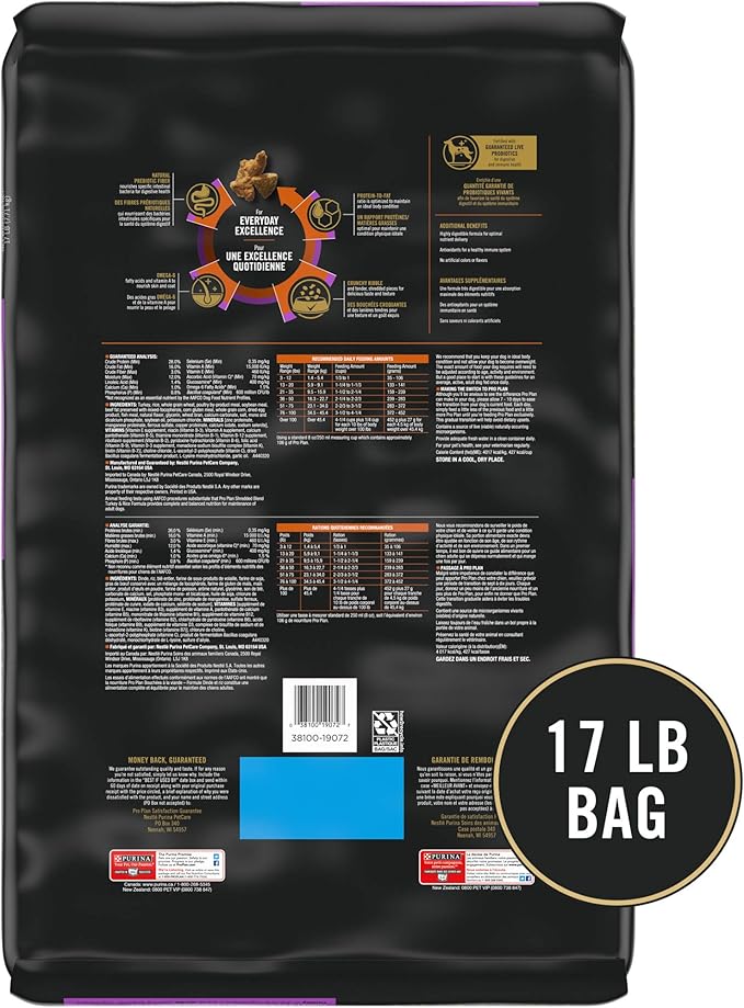 Purina Pro Plan High Protein Dog Food with Probiotics for Dogs, Shredded Blend Turkey & Rice Formula - 17 lb. Bag