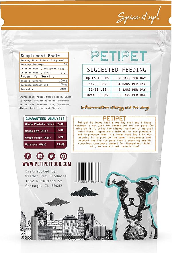 • ITCHING & ALLERGY RELIEF SUPPLEMENT: PETIPET Turmeric Bars are plant based soft chews made with natural and organic ingredients that help address the root underlying cause of allergies. Turmeric and Curcumin work together to boost the immune system and improve digestion. Quercetin is an all natural ingredient that has strong antioxidant & antihistamine properties and works to relieve your pup of itchy hot spots and skin irritation from environmental and food allergies.