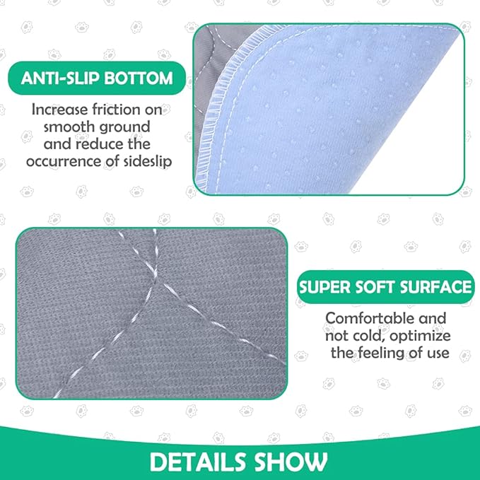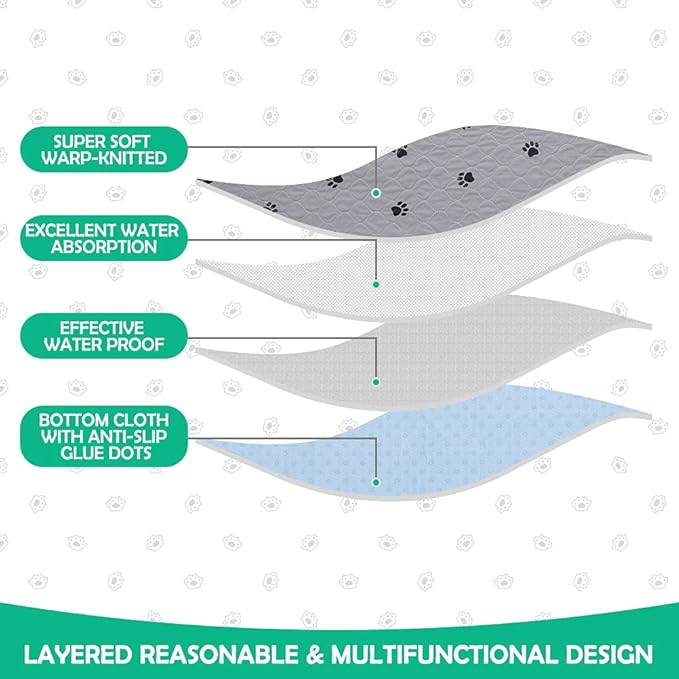 • 🐾【Fast Absorption & Lock odor】 - The first layer is made of top-quality and soft knitting fabric, which will let your pet always feel comfortable. The second layer is an absorbent layer that quickly absorbs and locks urine and other liquids, max capacity of 1600ml. The third layer is the water-proof layer which ensures urine won't leak to the floor. The fourth layer is a non-slip and stain-resistant bottom, it keeps the pad staying in place, and keeps your floor clean and dry.