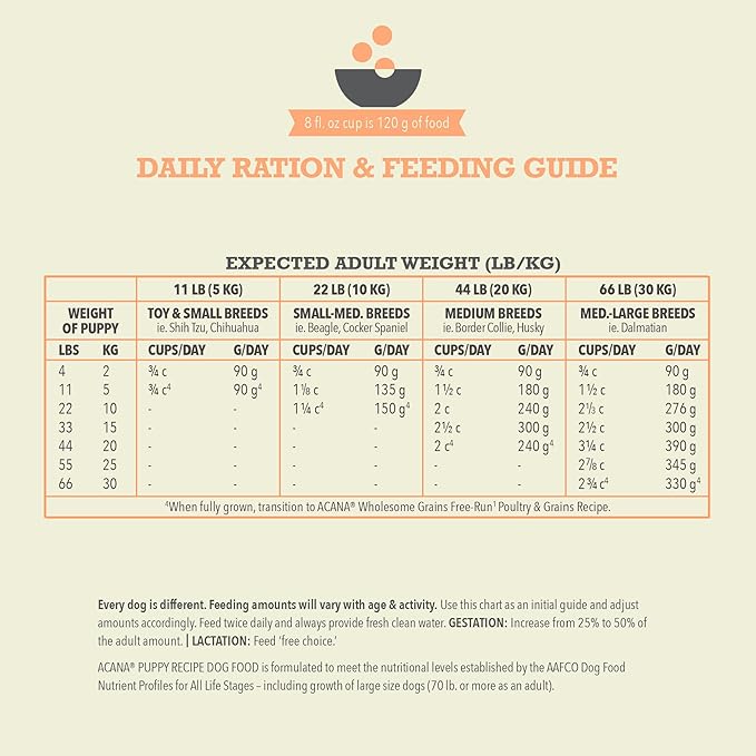 • One (1) 4lb bag of ACANA Wholesome Grains Dry Dog Food, Puppy Recipe, Real Chicken, Eggs and Turkey