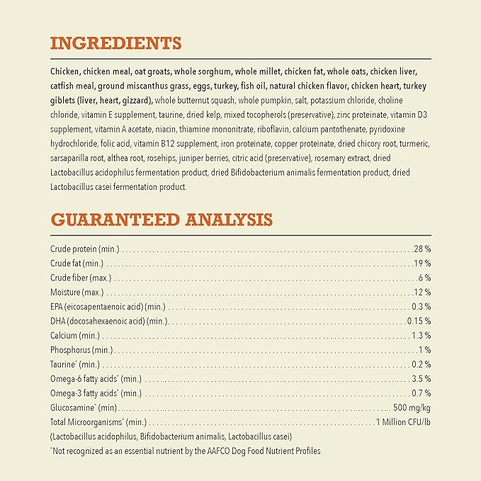 • A fiber-rich grain blend featuring oats, sorghum and millet, plus pre- and pre- and probiotics for dogs, helps provide dog digestive support.