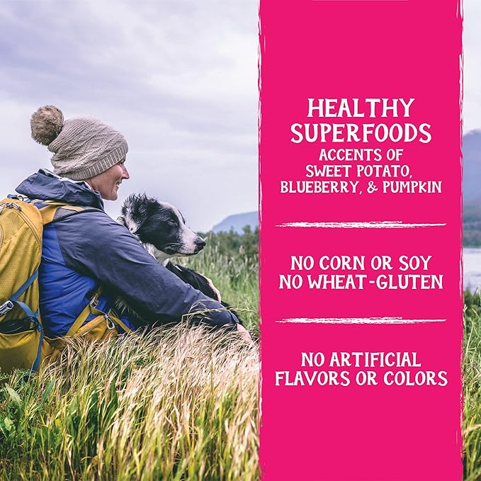 • Made with wholesome foods like sweet potatoes, peas, flaxseed oil, chickpeas, and blueberries.
