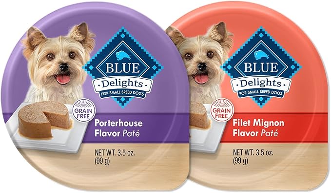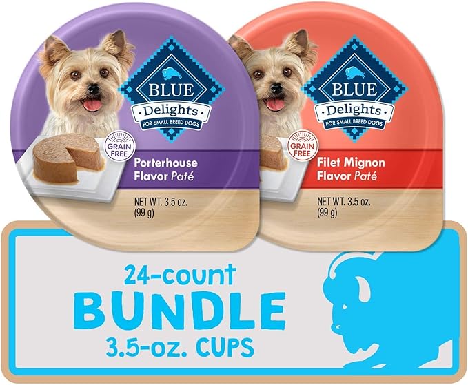 • Contains twenty four (24) 3.5-oz BLUE Delights Natural Adult Small Breed Wet Dog Food Cups, Porterhouse or Filet Mignon Flavor in Savory Juice