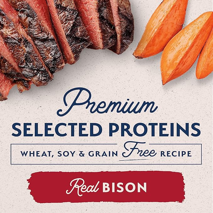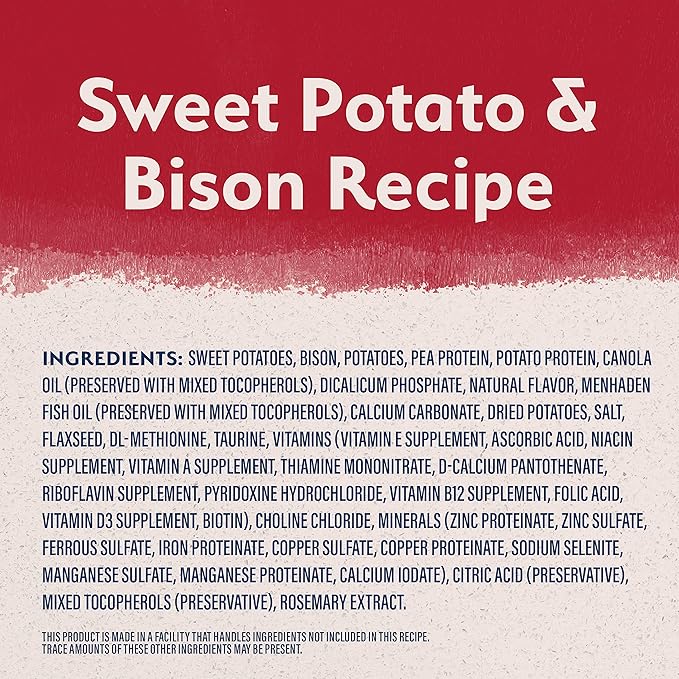 • BISON IS THE SINGLE ANIMAL PROTEIN SOURCE providing essential protein and amino acids to help maintain strong muscles; Sweet Potatoes are included as a grain-free source of fiber to help support digestive health; Contains (1) 22-Pound Bag