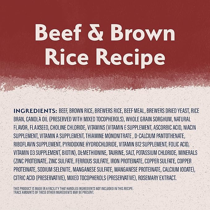 • BEEF IS THE FIRST INGREDIENT providing essential protein and amino acids to help maintain strong muscles; Brown Rice is included as a healthy and rich source of fiber for digestive health; Contains (1) 12-Pound Bag