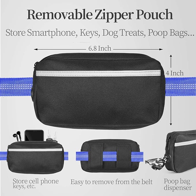 • Removable Zipper Pouch: Easily store and access your smartphone, keys, poop bags, dog treats in the removable zipper pouch. It’s a good add-on for the leash for training, walking, jogging, hiking training and running