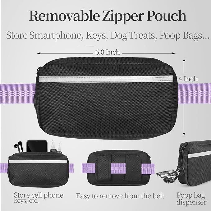 • Removable Zipper Pouch: Easily store and access your smartphone, keys, poop bags, dog treats in the removable zipper pouch. It’s a good add-on for the leash for training, walking, jogging, hiking training and running