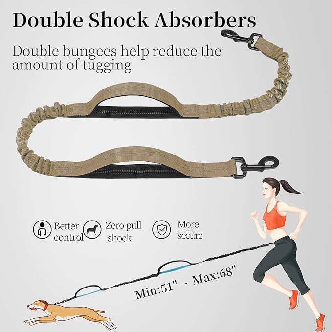 iYoShop Hands Free Dog Leash with Zipper Pouch, Dual Padded Handles and Durable Bungee for Walking, Jogging and Running Your Dog (Large, 25-120 lbs, Khaki)