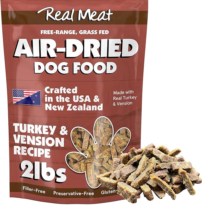 • GENTLY AIR-DRIED TO PAW-FECTION - Real Meat's secret air-drying process seals in the goodness, making every bite a punch of flavor and nutrition. This premium & nutritious turkey & venison dog food is perfectly bite-sized, making meal time something to look forward to