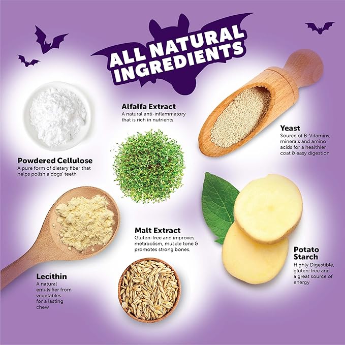 • GRAIN-FREE NATURAL TREAT: Treats crafted with no artificial colors, flavors, preservatives, gluten or meat. This edible, vegetarian chew is perfect for dogs with food allergies or sensitivities: low in fat, vitamin and antioxidant rich, with fiber to aid in good digestive health.