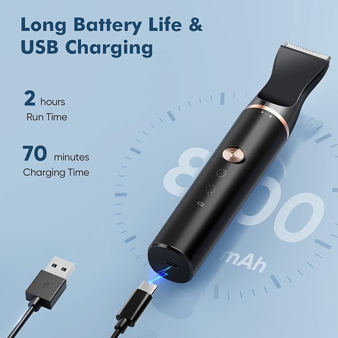 • 🐱 Built-in Battery. Rechargeable by USB with indicator light, make it more convenient, without changing batteries. This dog hair trimmer can be used for about 2 hours after 70 min of fully charging.