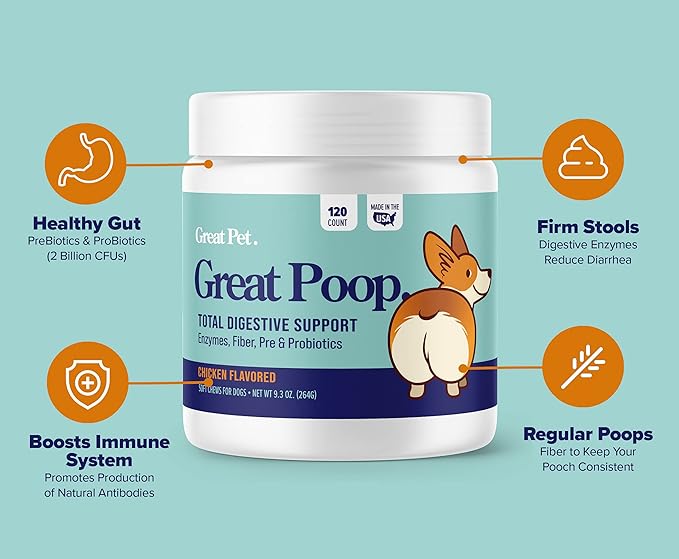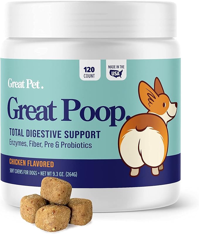 Great Poop Probiotics for Dogs - Fiber for Dogs Supplement with Dog Probiotics and Digestive Enzymes for a Healthy Gut, Firm Stool & Diarrhea Relief - Chicken Flavored Pet Soft Chews with Prebiotics