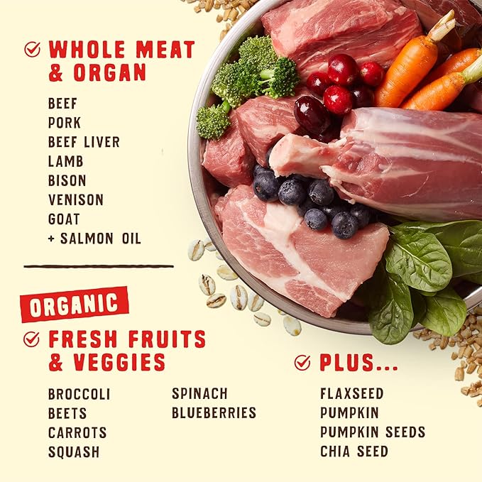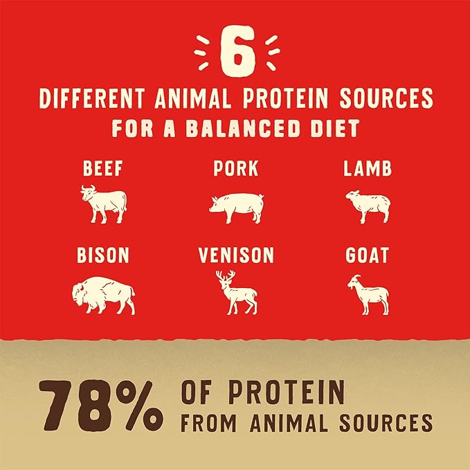 • Feed Your Dog’s Wild Side! Our Red Meat Recipe includes six animal protein sources that your dog will love: beef, pork, lamb, bison, venison and goat — perfect for dogs with poultry allergies