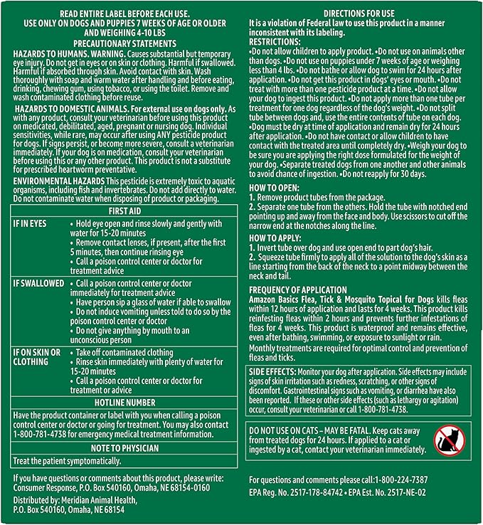 • One 4 dose pack of Amazon Basics Flea, Tick and Mosquito Topical for Small Dogs (4-10 pounds)