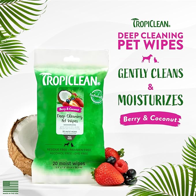 TropiClean Berry & Coconut Dog Wipes for Paws and Butt | Deep Cleaning Dog Grooming Wipes | Safe for The Face | Cat Friendly | 20 Count