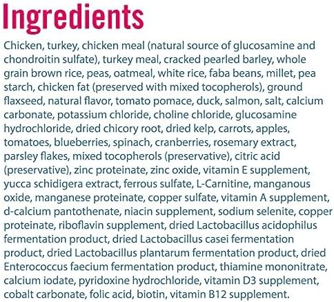 • MADE WITH REAL INGREDIENTS: Each 4.5 lb. bag of our Small Bites Mature Dog Food is made with real chicken, turkey, duck, salmon, cracked pearled barley, whole grain brown rice, veggies, fruit and herbs