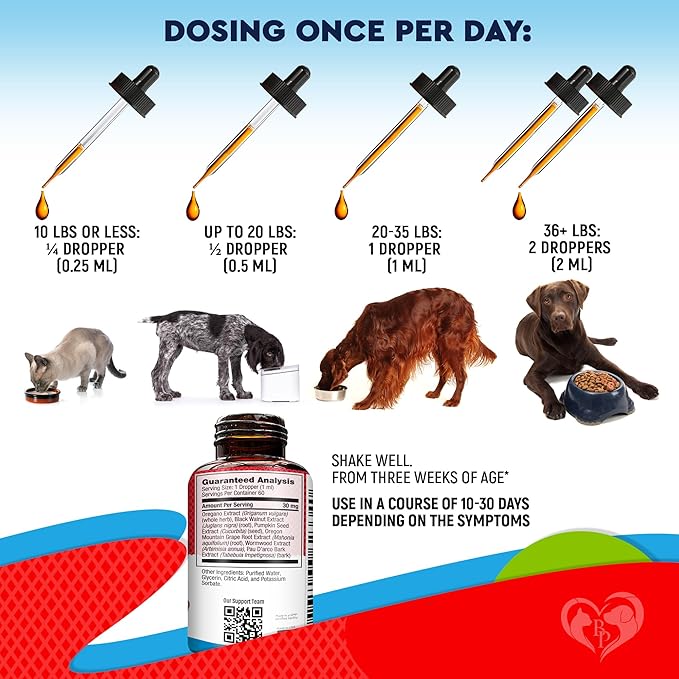 • ✅ Dose once to twice a day: Cat, kittens,gatos and dog, puppy, perros up to 20 lbs ½ drop, dogs 20-35 lbs 1 hook drop, dogs 36 lbs 2 meds drops. Protect your pets all year round. Plus, even the pickiest of them will like the taste!