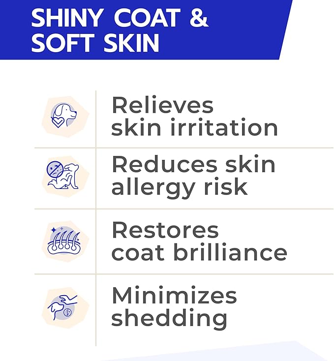 • Dog Skin & Coat Supplement, Allergy Relief - each chew is formulated with Fish oil, essential vitamins and elements to help your pet with hot spots and dry, itching, irritated, sensitive, and flaky skin, prevent shedding, while promoting soft, shiny skin and coat.