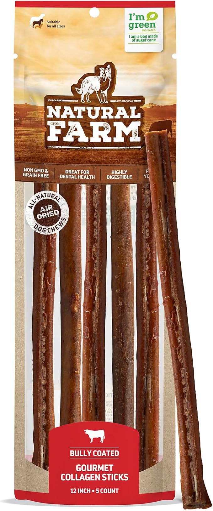 Natural Farm Bully Coated Gourmet Collagen Sticks (12 Inch, 5 Pack), Real Bully Beef Coated, 95% Natural Collagen, Supports Healthy Joints, Skin & Coat - Best for Small & Medium Dogs