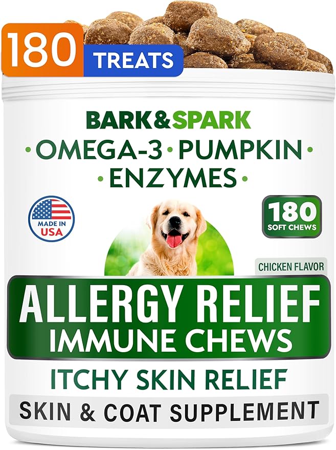 BARK&SPARK Dog Allergy Relief Chews (180 Immune Treats) - Anti-Itch Skin & Coat Supplement - Omega 3 Fish Oil - Itchy Skin Relief Treatment Pills - Itching&Paw Licking - Dry Skin & Hot Spots -Chicken