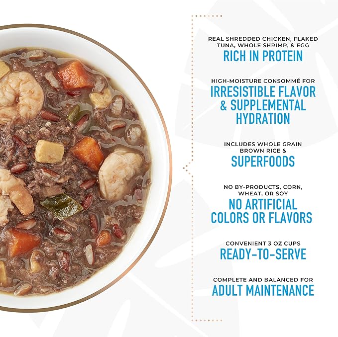 • SUPER FOODS & HEALTHY WHOLE GRAINS - Powerful ingredients like shredded chicken, flaked tuna, healthy whole grain brown rice, egg, & nutrient-rich superfoods in chicken consomme for maximum nutrition for dogs of all ages. Delete sweet potato and flaxseed - call out egg and whole grain brown rice instead. An option is Shredded chicken, flaked tuna, healthy whole grain brown rice, egg, & nutrient-rich superfoods in chicken consomme. (approved by Kim)