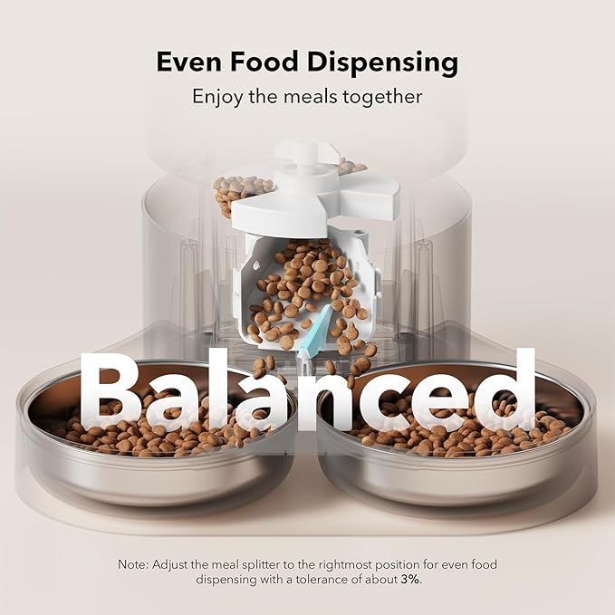• Feed Two Cats: PETLIBRO automatic cat feeder for two cats comes with an adjustable meal splitter. The unique movable meal splitter ensures food is distributed evenly, and the size of the portions can be adjusted to suit the needs of different cats and dogs. You can be sure your pets won’t have any fights.
