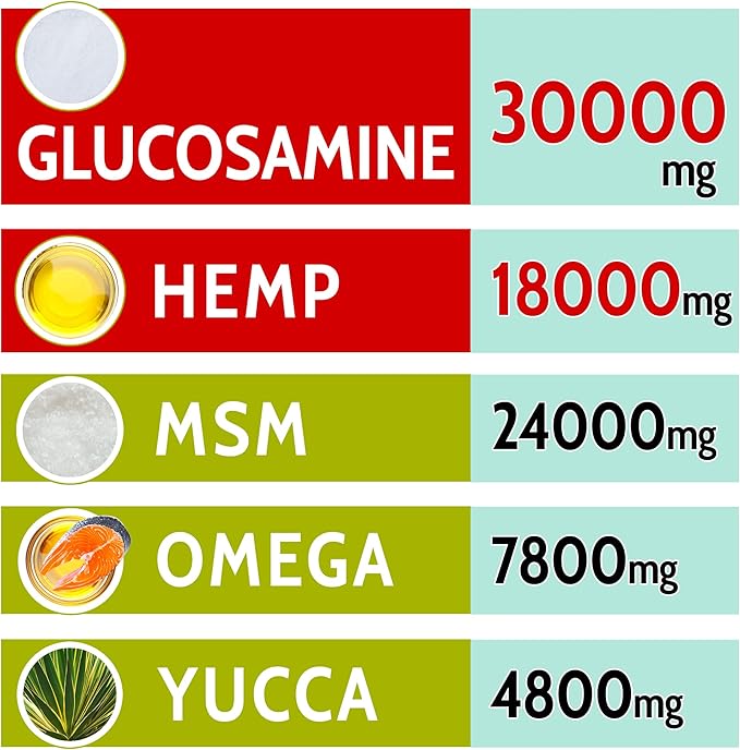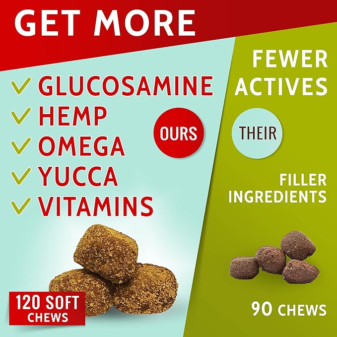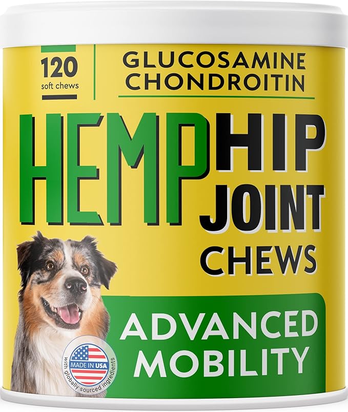 Hemp Treats for Dogs - Hip and Joint Supplement w/Glucosamine, Chondroitin, MSM, Omega 3 - Joint Pain Relief - Advanced Formula - Senior Dog Aid - Made in USA - 120 Chews