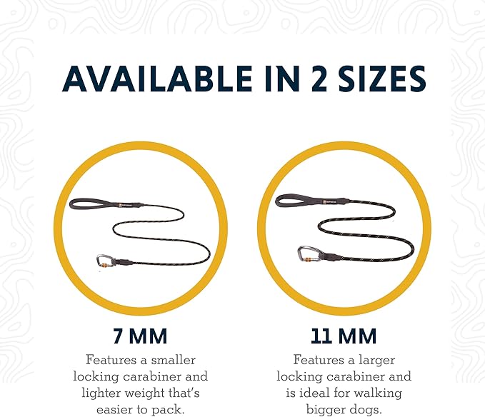 • Size options: The 7 mm size features a smaller carabiner and thinner rope for greater packability; The 11 mm size features a bigger carabiner and thicker rope for larger dogs; Both measure 5 ft long