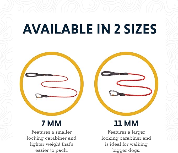 • Size options: The 7 mm size features a smaller carabiner and thinner rope for greater packability; The 11 mm size features a bigger carabiner and thicker rope for larger dogs; Both measure 5 ft long