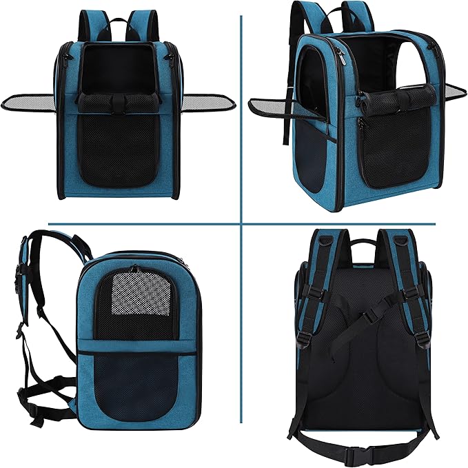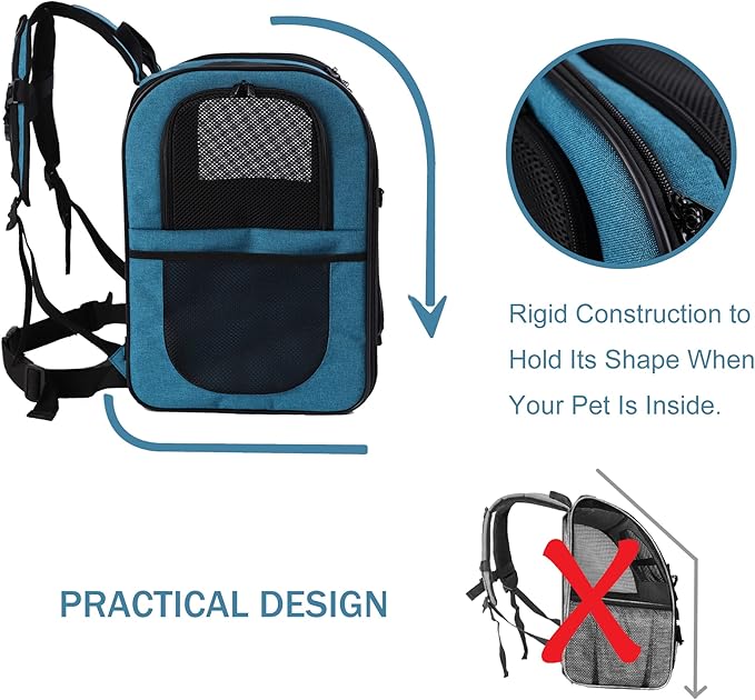• BETTER CONSTUCTION-Well ventilated design for optimal airflow, two-way entry for easy access, top mesh window for more headroom and visibility, and thick, soft fleece bedding for your pet resting and relaxing. This backpack is firmly structured, providing ample room for your pet to move around.