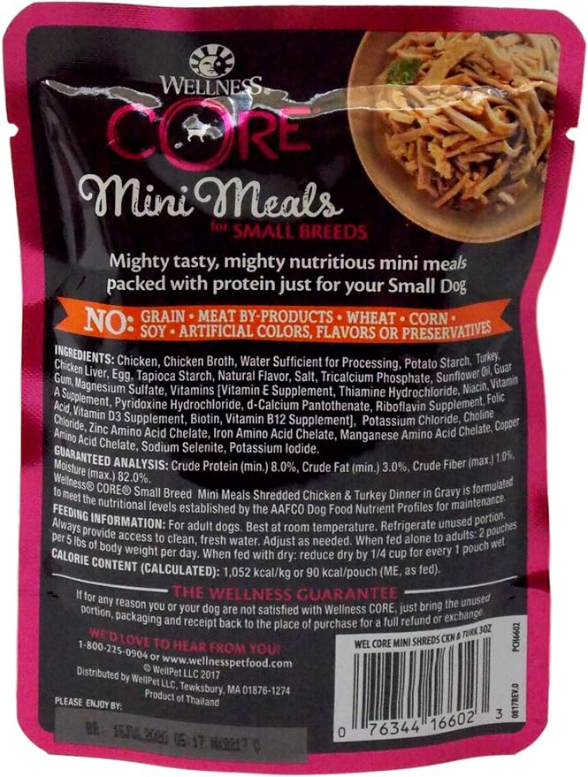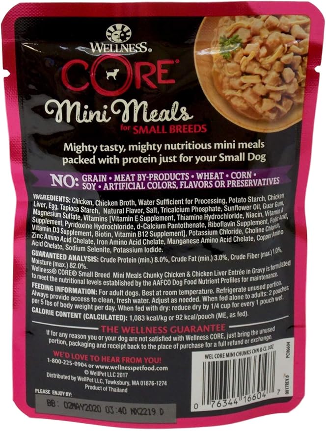 • Bundle Includes: Wellness Core Mini Meals Grain Free Small Breed Food 2 Flavor 6 Pouch Variety - (3) Each: Chunky Chicken Liver, Shredded Chicken Turkey Gravy (3 Ounces) - Plus Rope Toy; Bundle Includes: MerlinsMart Furry Family Friends 40 Fun & Useful Animal Facts Your Family Will Love Booklet and Mammoth Mini Rope Toy (color will vary)