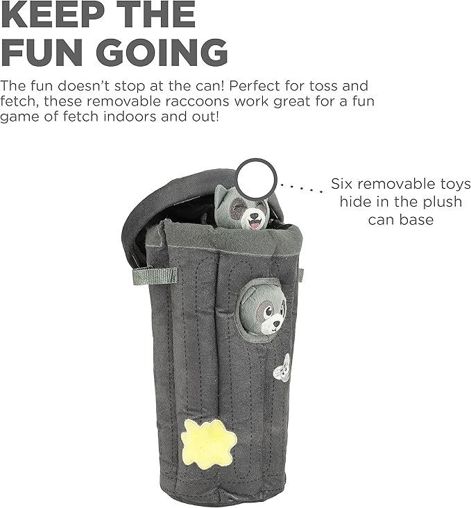 • HIDE and SQUEAK FUN: The Hide A Raccoon dog puzzle is an easy way to get pups engaged for hours of fun. Just fill the trash bin with the 6 squeaky plush toys, toss it, and let your dog's natural hunting instincts kick in.