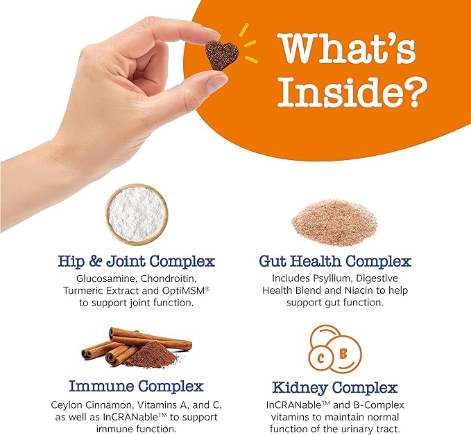 • Hip, Joint & Performance Support - Each dog chew features OptiMSM, a premium form of MSM for muscular support, Glucosamine HCl and Chondroitin Sulfate for hip and joint support plus Cod Liver Oil and B-Complex Vitamins support normal physical performance.