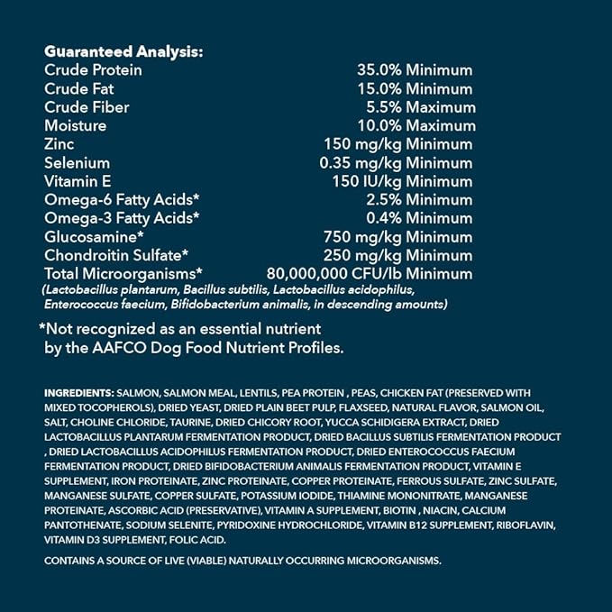 • Nutritious vegetables like lentils and peas provide vitamins, minerals, antioxidants, and phytonutrients; salmon oil and flaxseed provide omega-3 fatty acids, including long-chain DHA