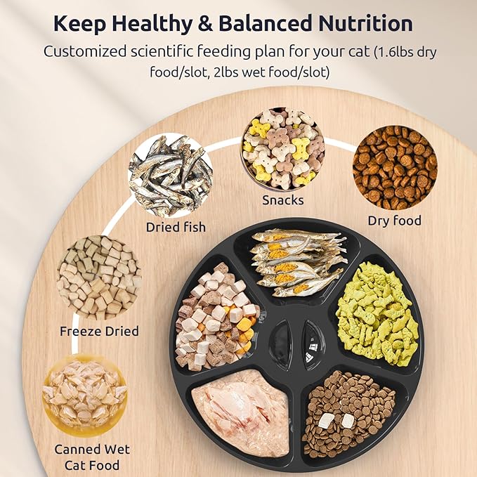 • 😸Precise Portion Control - With a built-in timer, this auto pet feeder features 5 compartments for use with dry, moist, and wet food or even treats and medicines. (Each tray slot holds for 1.6lbs dry food or 2 lbs wet food.) ORSDA automatic cat feeder delivers precise portions and dispense small amounts of food at certain intervals. Ideal for cats, small dogs, dieting pets, aging pets or other pets that requires more frequent feeding or with special needs.