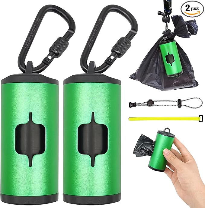 2 Pack Metal Dog Poop Bags Holder Aluminum Poo Bags Dispenser with 30 Black Unscented Pet Waste Bags and 3 Leash Accessories for Dog Walking(2 Holders 30 Bags,Green)