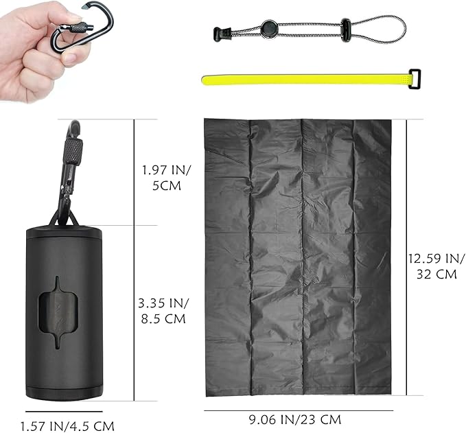 • What you get:2 doggy poo bags dispenser with 30 black unscented leak-proof poop bags,6 leash accessories:2 keychain with lock,2 elastic cord for hanging used doggie poo bags and 2 hook and loop fastener for dog walking.